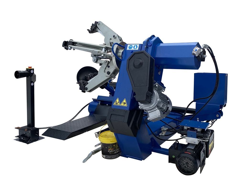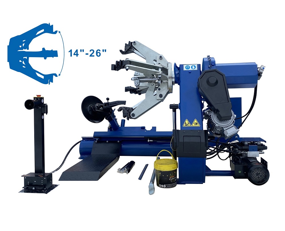 Станок шиномонтажный для колес грузовых автомобилей и автобусов, 2,2+2,2 кВт, 380 В, диаметр дисков 14-42", максимальный диаметр колеса 2300 мм (90"), ширина колеса до 1050 мм (41"), вес колеса до 1200 кг., универсальный 4-х кулачковый зажим, мобильная стойка управления. Может использоваться с камерными и бескамерными колесами.