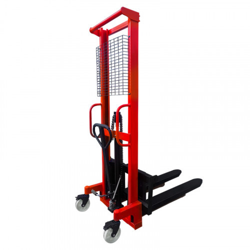 С заботой о безопасности оператора, на штабелере установлена защитная металлическая сетка. С целью повышения комфорта работы, на штабелере имеется курок для опускания вил, педаль для спуска и дополнительная ножная педаль, а рукоять управления имеет прорезиненное покрытие.