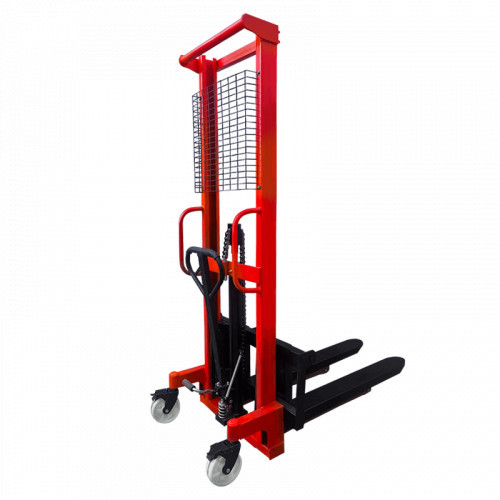 С заботой о безопасности оператора, на штабелере установлена защитная металлическая сетка. С целью повышения комфорта работы, на штабелере имеется курок для опускания вил, педаль для спуска и дополнительная ножная педаль, а рукоять управления имеет прорезиненное покрытие.