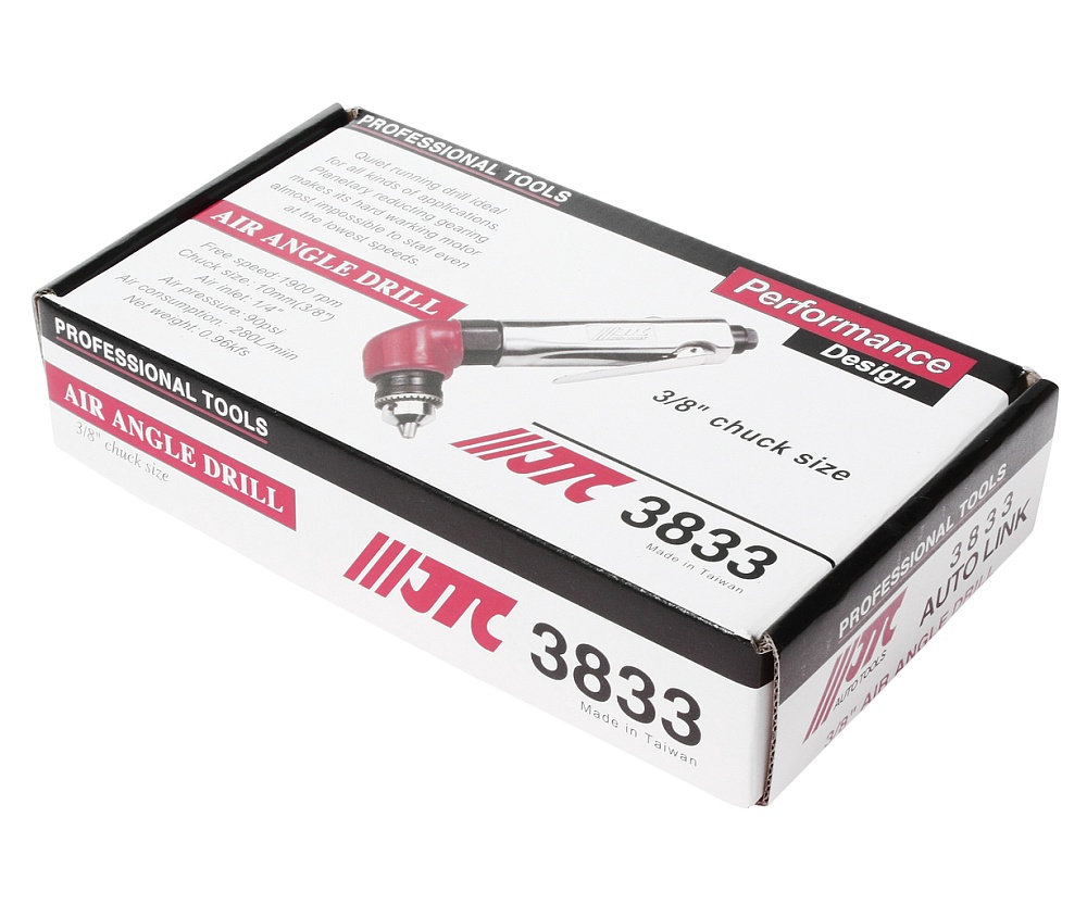 Угловая пневмодрель JTC 3833 используется для работы в труднодоступных местах - например, в небольших нишах или за трубами отопления и водоснабжения.