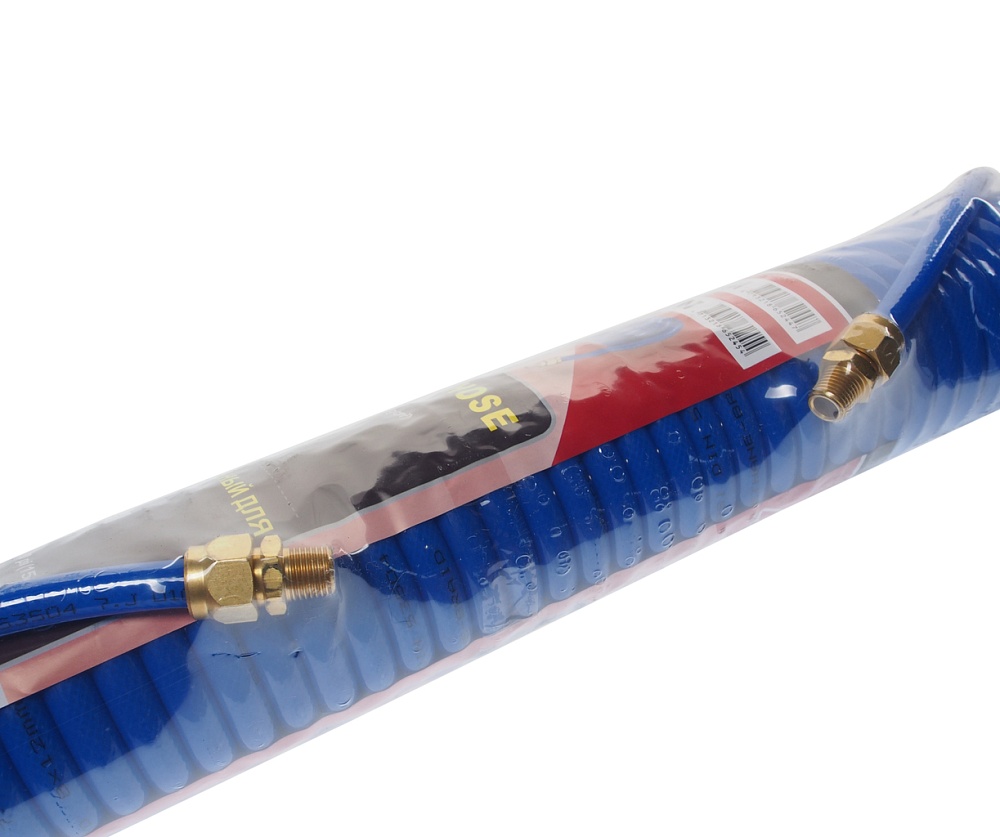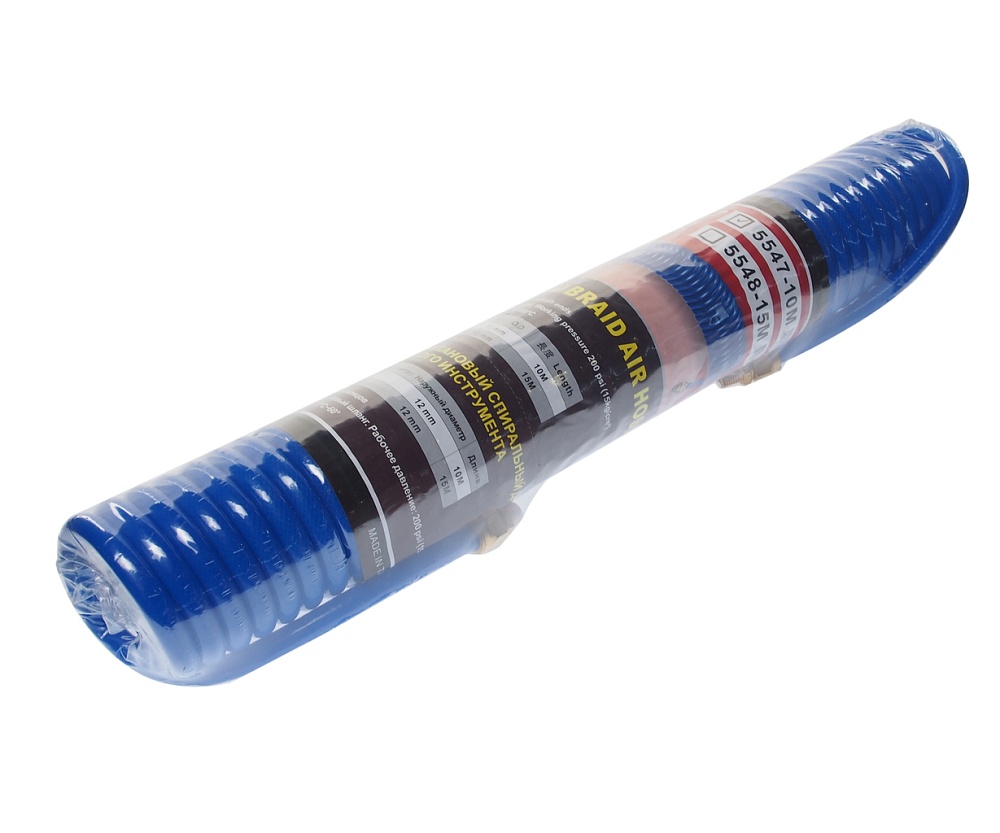 JTC-5547 Шланг воздушный спиральный. С фитингами на 1/4" (папа) на обоих концах. Полиуретановый шланг с оплеткой. Рабочее давление 200 psi (15 кг / см²). Рабочая температура: -20...+60°C. Длина: 10 метров.