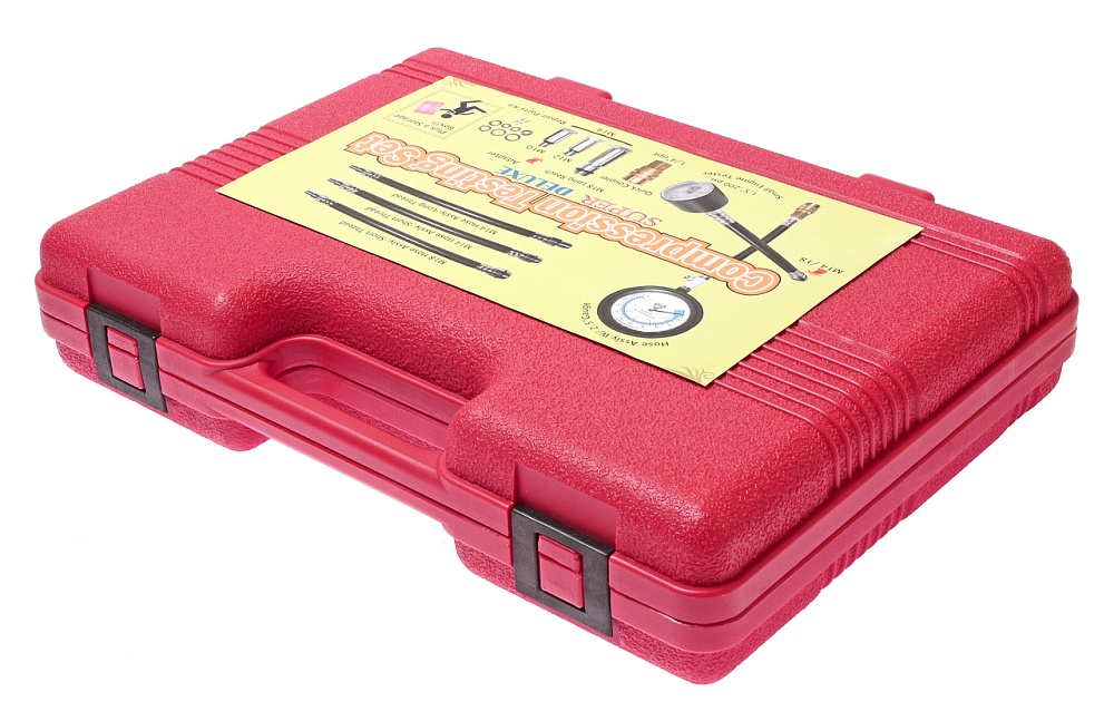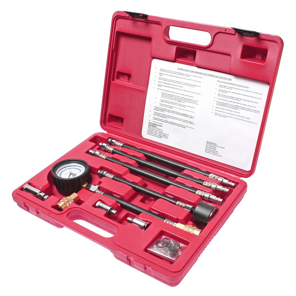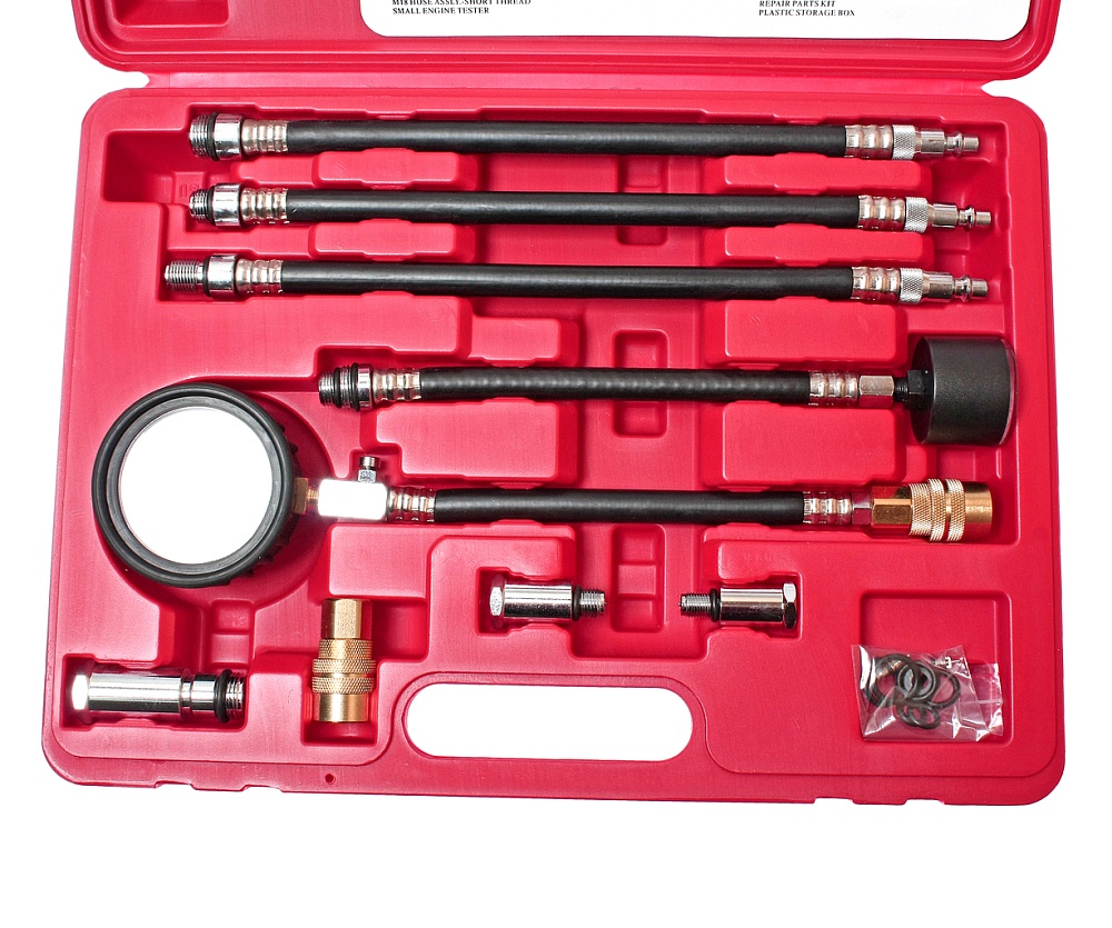 Манометр (0-300 PSI) с высоконапорным резиновым шлангом (длина с надставками 230 мм), на конце шланга быстросъемный соединитель, позволяющий повторять измерения сжатия без вывинчивания. На другом конце шланга клапан сброса.