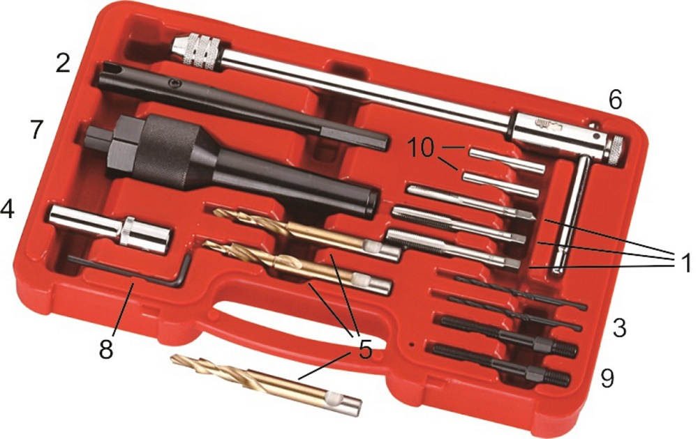В набор входят сверла различного диаметра, втулки, конусы, а также метчики для восстановления резьбы.