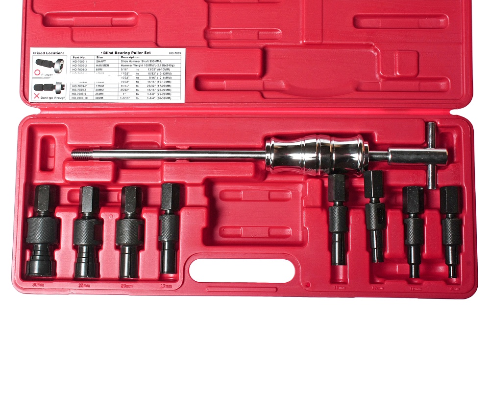 Набор представляет собой специализированную группу инструментов, предназначенных для демонтажа при обслуживании подшипников, зубчатых колес, шкивов и иных частей привода.