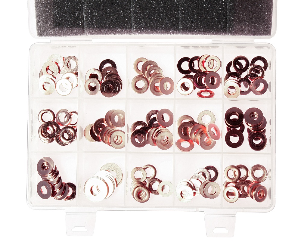 Универсальные медные шайбы 15-ти различных диаметров подходят для любых форсунок инжекторной системы.