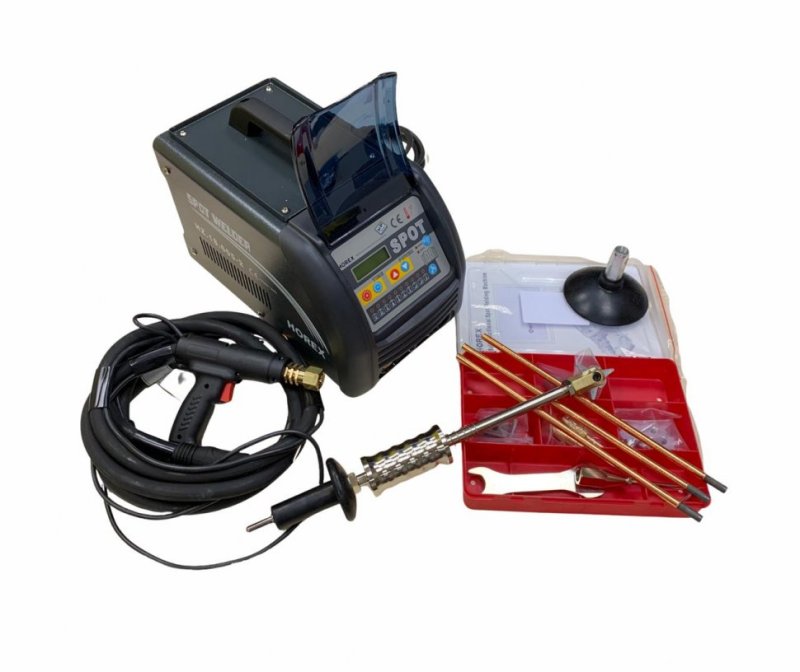 horex Аппарат точечной и контактной сварки (односторонняя) Конструктивные особенности: 1.Микропроцессорное управление 2.Обширная регулировка тока 3.Автоматический переход в режим ожидания 4.LCD дисплей (многофункциональная система управления) Функции: Приварка ремонтных шайб и точечная приварка металлическим электродом для вытягивания металла панели; Прогрев углеродным электродом с последующим охлаждением позволяет производить осадку металла; Односторонняя точечная сварка Технические данные: Напряжение: 220В 50Hz Максимальная мощность: 10,0 кВт Макс. ток сварки 1200 A Толщина свариваемого металла 0,8-1,2 мм Вес 35кг