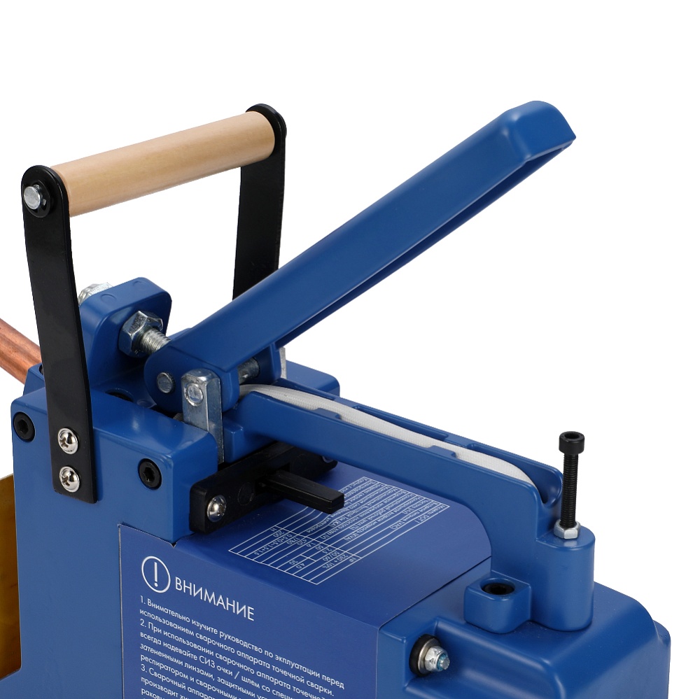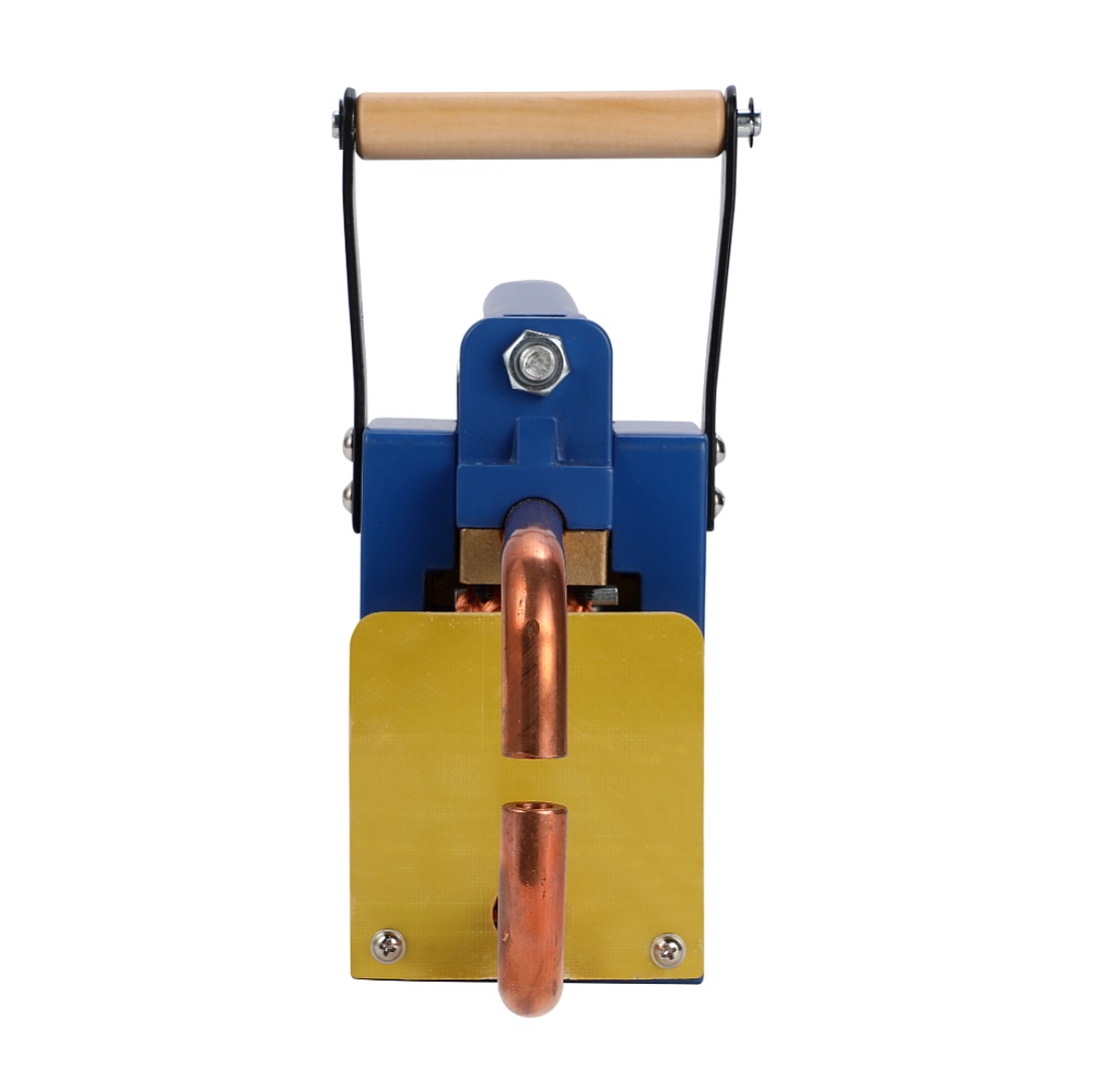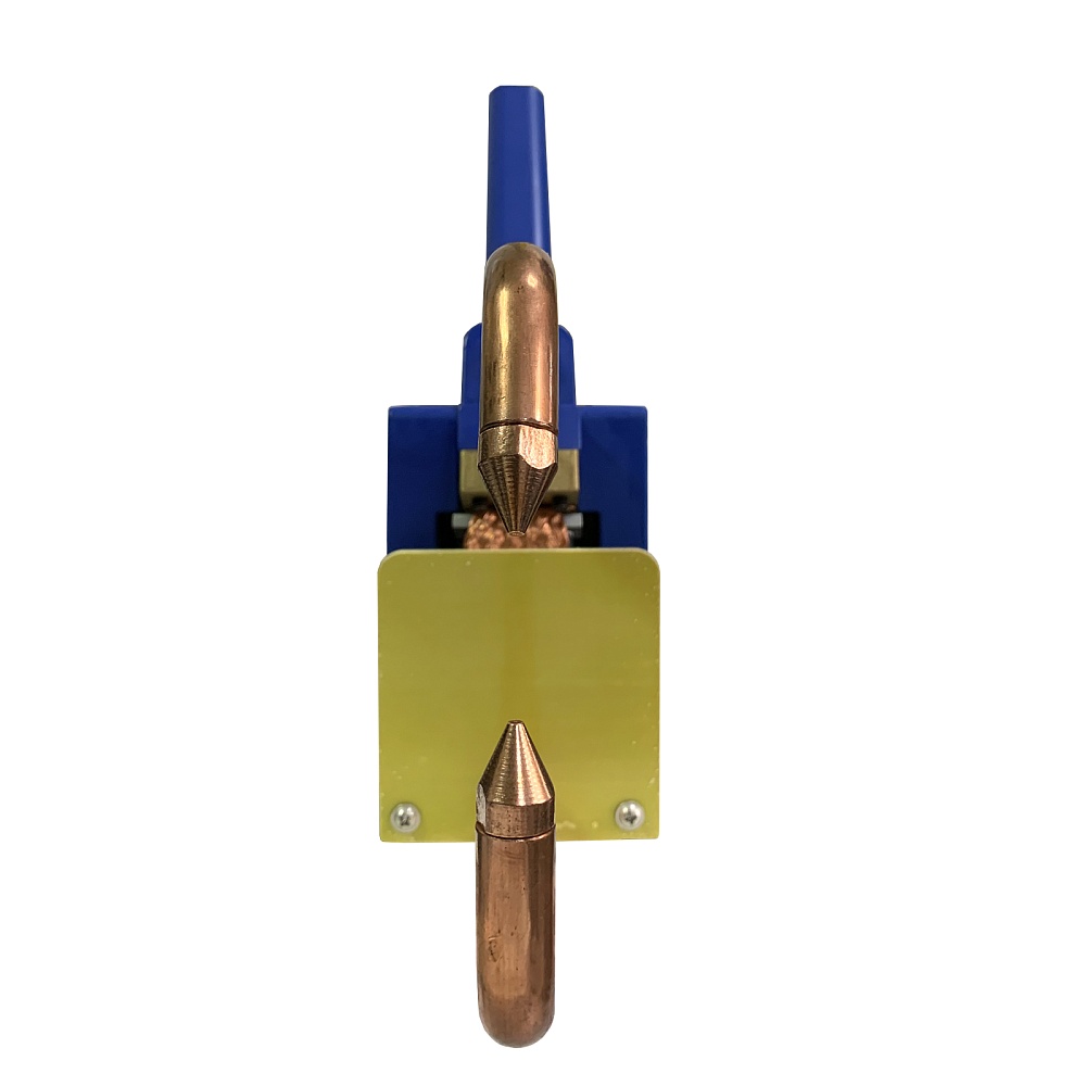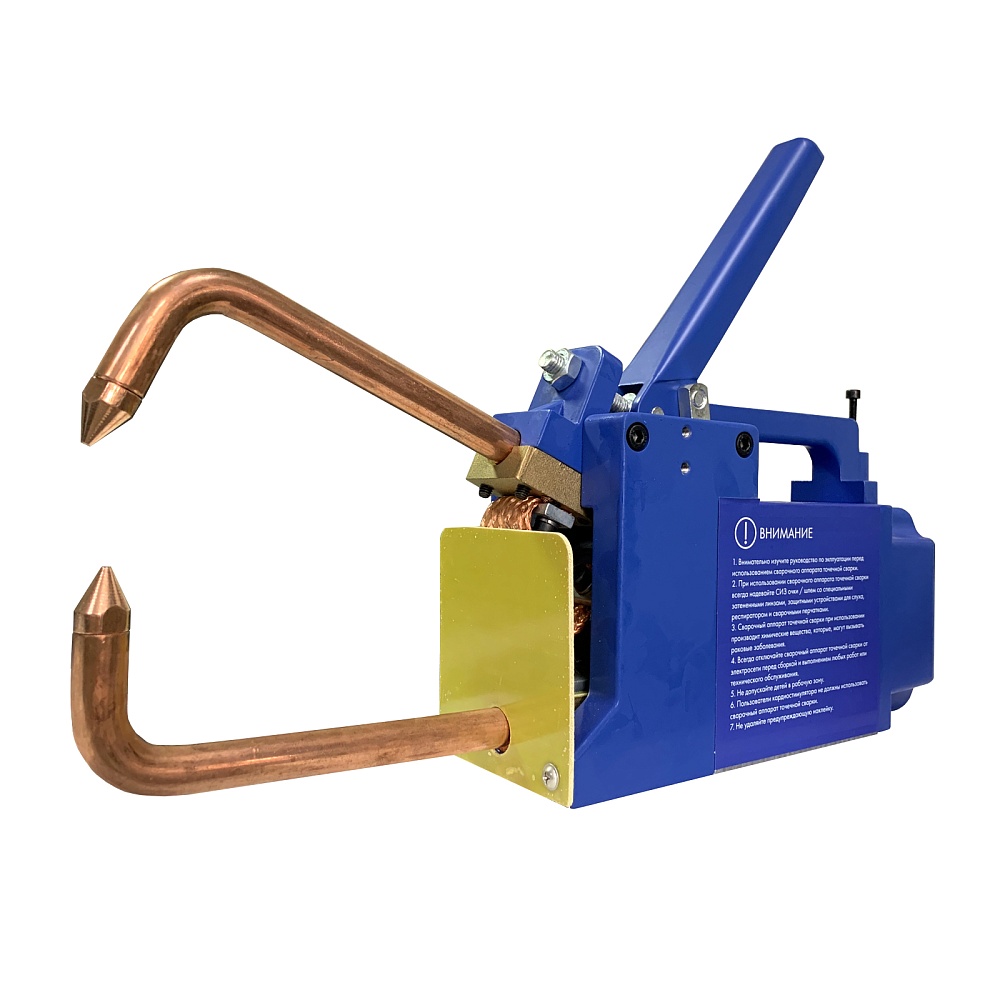 Предназначен для сварки деталей одинаковой толщины, наложенных друг на друга. За счет компактности может использоваться на весу. Сложенные детали устанавливаются между электродами и фиксируются прижимным рычагом, кратковременный импульс тока большой мощности нагревает металл, и под нажимом детали сплавляются в точке контакта. Минимальная толщина деталей 0,5+0,5 мм, максимальная 1,5+1,5 мм.Запасные электроды в комплекте. Сварочный аппарат легкий и компактный. Контактная сварка 6300А/220В/1ф. Ручные клещи.