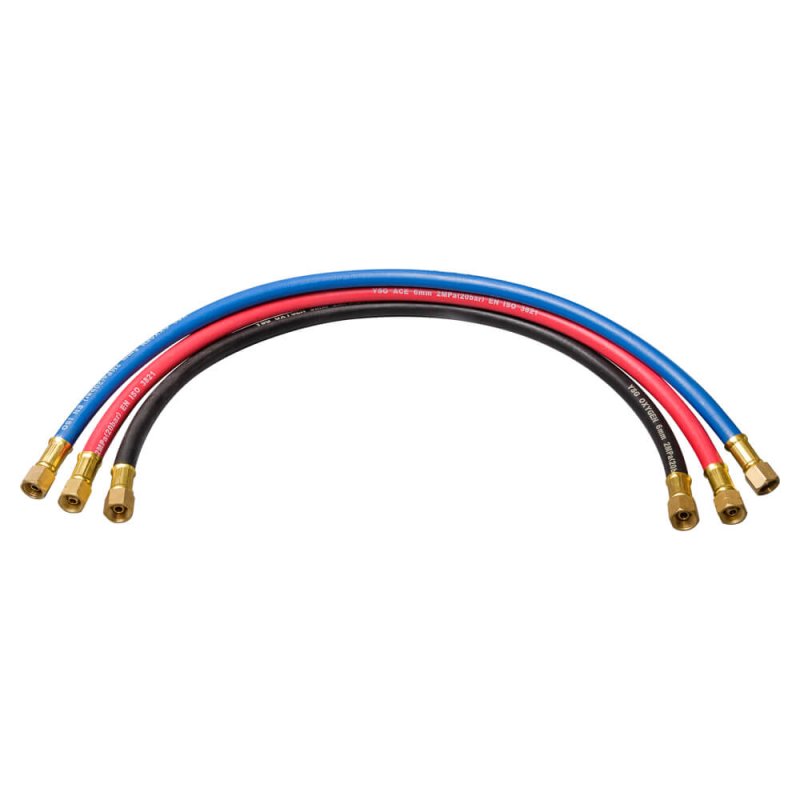 К вентилю КП (кислород подогревающий) крепится синий рукав, а к вентилю КР (кислород режущий) – чёрный рукав. Данные вентили размещаются на одной стороне газового коллектора и обозначены буквенным кодом «OX». Крепление рукавов к вентилям происходит при помощи развальцованной гайки М12х1,25, с обратной стороны рукав крепится на присоединительный штуцер машинного резака с аналогичной резьбой. К вентилю ГГ (горючий газ) крепится красный рукав для подачи газа. В данном случае резьба присоединения М12х1,25LH.
