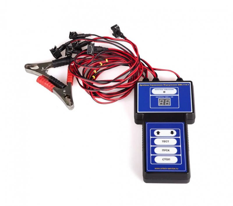 Драйвер управления форсунками (Реаниматор форсунок). Драйвер управления форсунками нового поколения SMC-114 оснащен линейной шкалой показаний имитации -об/мин, датчиком и звуковой сигнализацией в случае замыкания инжектора, автоматической адаптацией под любое рабочее напряжение форсунки. драйвер выполнен в виде электронного блока, питающего кабеля и кабеля для подключения клапанов электромагнитных форсунок.