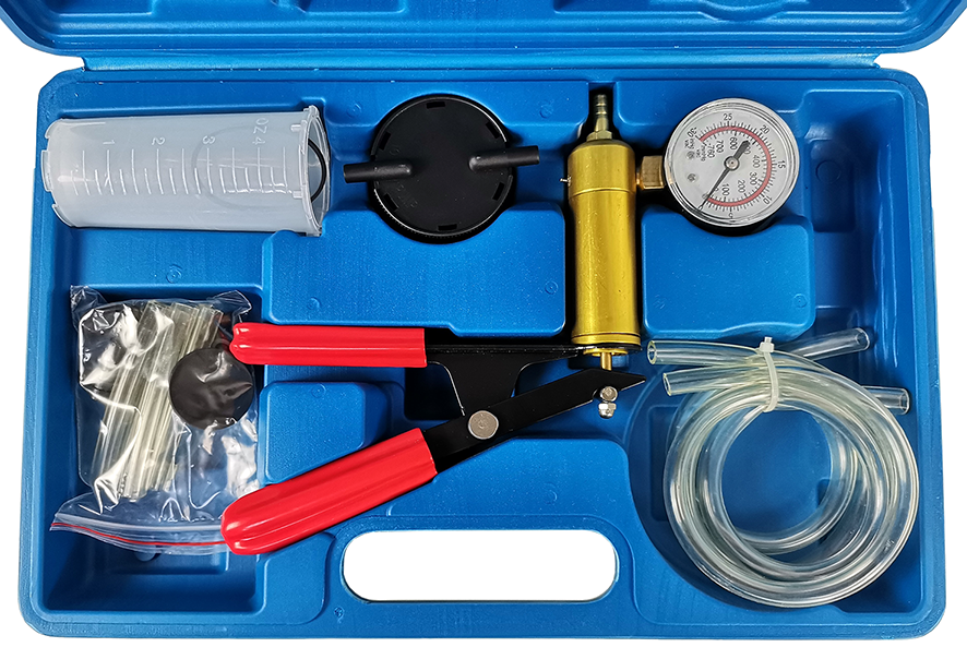 Вакуумный насос, 2шт шланга длиной 80см, 8шт адаптеров, пластиковый стакан для тормозной жидкости.