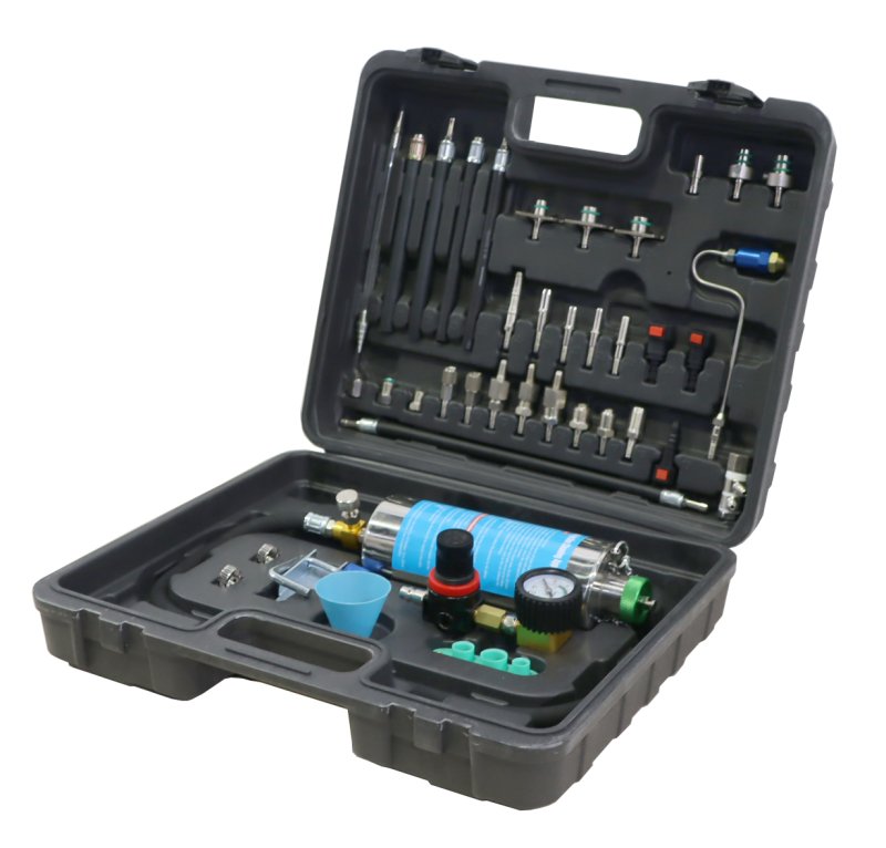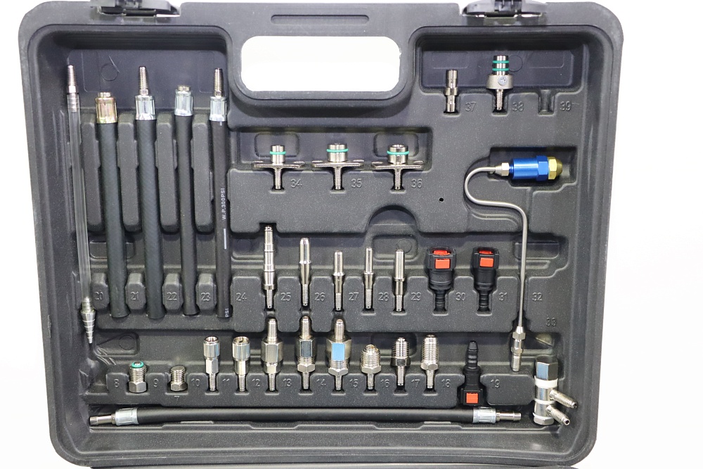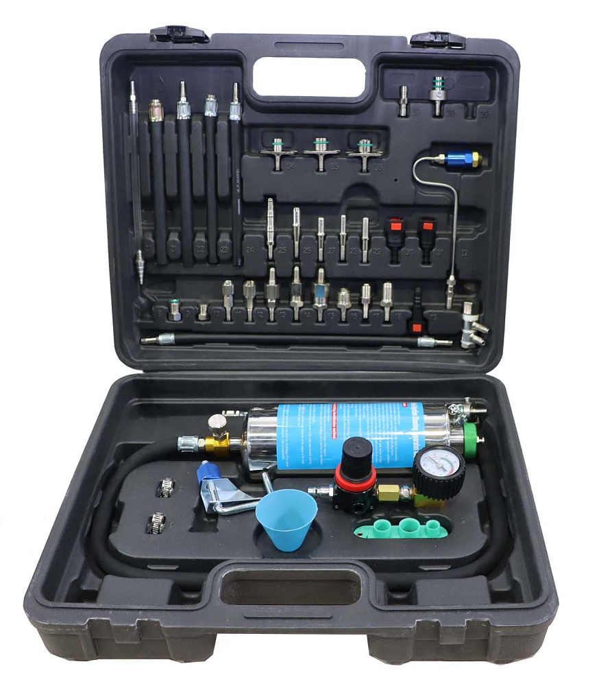Комплект инструментов, приспособлей и адаптеров Kraftwell KRW-FSF для тестирования и промывки топливной системы дизельных и бензиновых автомобилей без демонтажа.