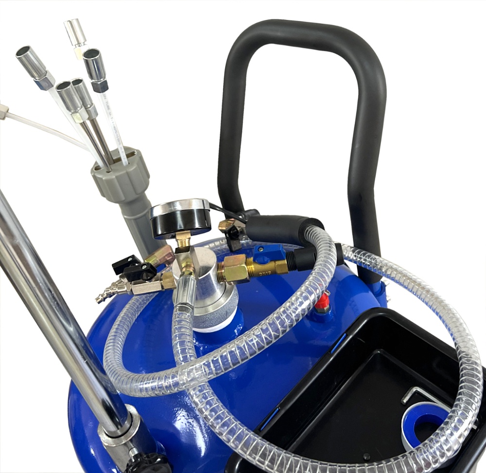 • Продуманная конструкция: 6 щупов со специальной тубой для их хранения, широкая воронка для слива, манометр и подвижная колесная база.<br>