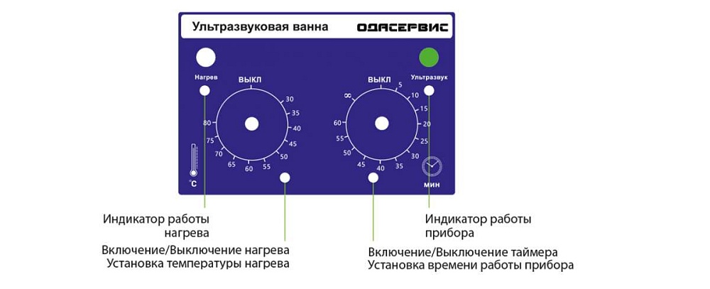 Использование таймера. Рабочее время выставляется по шкале на поворотном переключателе. О старте работы прибора, а также об ее окончании сигнализирует световой индикатор и звуковой сигнал. Процесс очистки прекращается автоматически по истечении установленного времени. Время можно задать от 0 до 60 минут, а также  можно установить режим "Бесконечность"  и прервать процесс в принудительном (ручном) порядке.