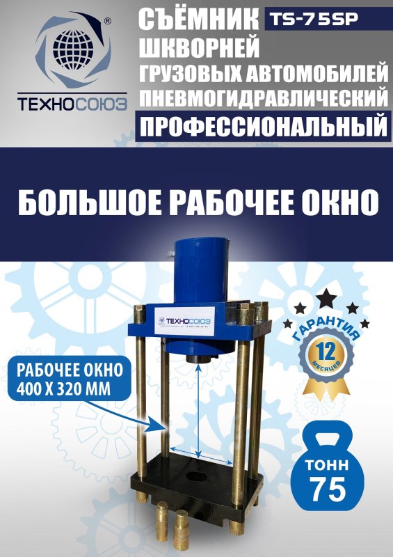 Профессиональный съемник шкворней TS-75SP для грузовиков (MAN, Mercedes, Scania, Volvo, КамАЗ, корейские/китайские), тракторов, погрузчиков, спецтехники — усилие 75 тонн, пневмогидравлика, ход поршня 160 мм, диаметр шкворня до 60 мм. Рабочее окно 400×320 мм, расстояние шпилек 320 мм. Мобильный с колесами.